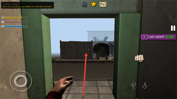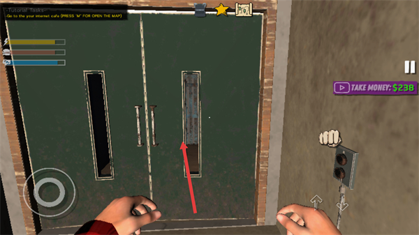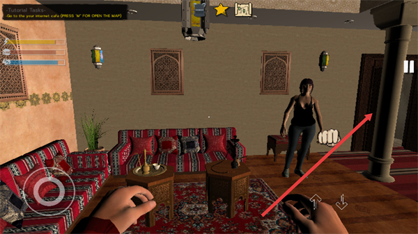 1、教程任務為前往網吧,當前處于室內場景,按提示找到對應房門,移動至場景中的門位置,準備通過該門前往下一個區域,推進前往網吧的任務流程。
