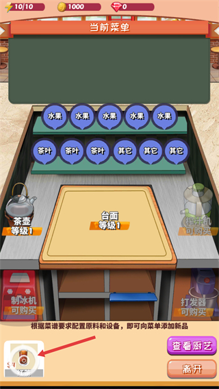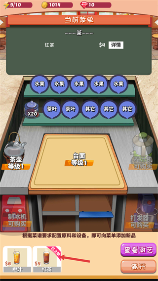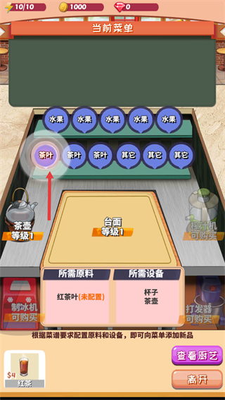 4、配置好原料后,紅茶會成功上架到當前菜單,界面顯示紅茶的價格為4,同時原料區域會顯示紅茶葉的數量,完成后即可在菜單中提供該新品。