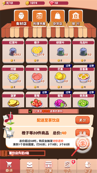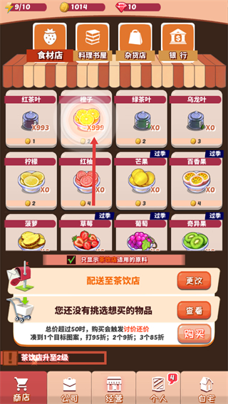2、進入食材商店后,可查看各類食材庫存,選中橙子后能看到當前數量,可通過操作調整購買量,還能利用滿減規則優惠采購,補充制作飲品的原料。