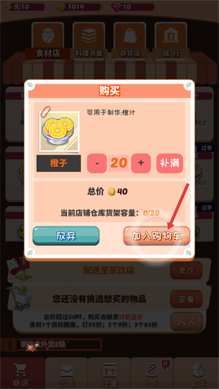 3、選中橙子后彈出購買窗口,顯示其可用于制作橙汁,單個花費20資源,可調整購買數量,確認后點擊加入購物車,需注意倉庫貨架容量避免超限。