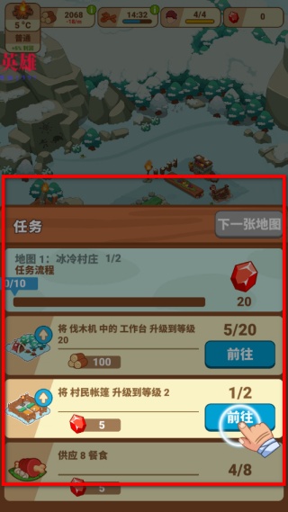 1、查看任務列表,找到當前待完成的任務,比如升級村民帳篷,點擊任務旁的前往按鈕,進入對應建筑的操作界面,按要求完成升級來推進任務進度。