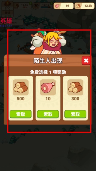 3、遇到陌生人出現的彈窗時,可免費選擇一項獎勵,點擊對應獎勵下方的索取按鈕,獲取木材或食物等資源,這些資源能用于后續的建筑升級或任務推進。