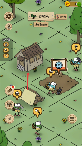 4、建筑完成后會出現在場景中,當前氣溫有所上升,場景內出現更多互動元素,可點擊建筑進行后續操作,同時場景中的角色會開展對應活動,繼續利用建筑功能推進游戲進程。