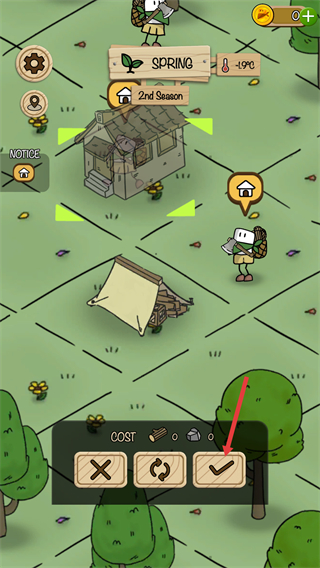 1、界面顯示當前處于春季第二季,場景中有帳篷、樹木及各類功能按鈕,點擊對應工具按鈕可開啟建造等操作,需關注資源狀態,合理規劃場景內的互動行為。