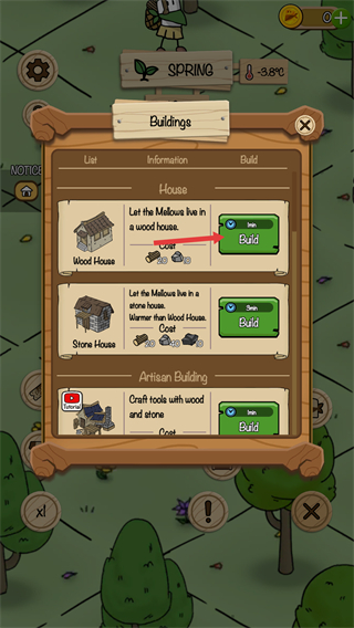 2、打開建造界面后,可查看不同建筑選項,比如木屋、石屋等,每個建筑標注了功能、所需資源及建造時長,滿足資源條件后點擊建造按鈕即可啟動建筑流程,按需選擇合適建筑。