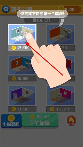 1、進入游戲先看到不同房間的購買選項,每個房間標注對應價格,根據提示點擊對應房間,花費金幣買下屬于自己的第一個房間。