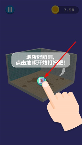 2、進入房間后看到地板臟亂的提示,按照指引點擊地板區域,就能啟動打掃操作,清潔房間的臟污部分,推進房間整理進度。