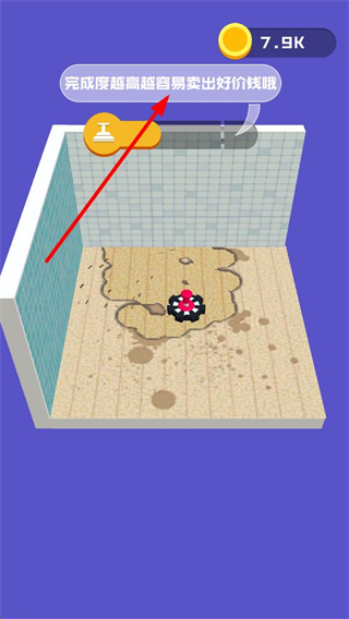 3、打掃后會出現裝修相關指引,了解完成度越高越易賣出好價錢的規則,借助工具繼續處理房間,提升房間的裝修完成度。