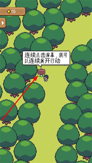 1、進入游戲后看到提示連續點擊屏幕可連續展開行動,操控角色森林場景中,按指引點擊對應區域,推進角色的行動流程。