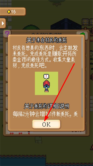 4、之后會出現村民委托的說明界面,了解到完成委托是賺取金幣的佳徑,每隔2分鐘會新增委托,點擊OK關閉說明后可處理委托。