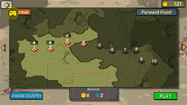 1、在關卡選擇界面選定目標關卡后,底部顯示該關卡通關可獲金幣與星星獎勵,點擊按鈕即可進入。