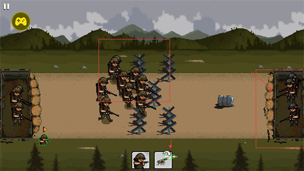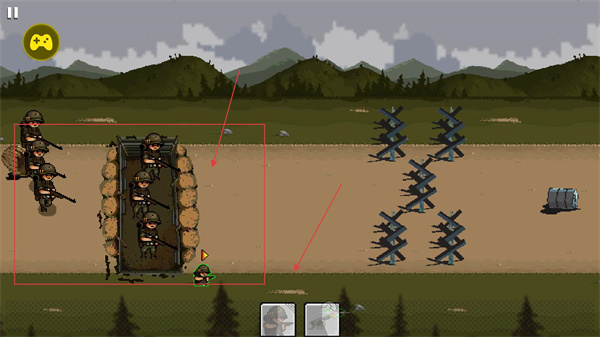 2、進入戰斗后,敵方布置了鐵絲網類防御工事,需指揮我方部隊從掩體出動,向敵方區域推進以發起進攻。