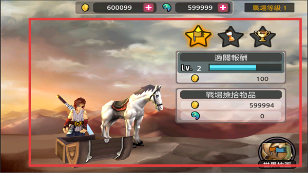 4、消滅所有敵人完成挑戰后,會進入闖關結算界面,可獲得等級提升、金幣等獎勵,可選擇返回世界地圖繼續挑戰。