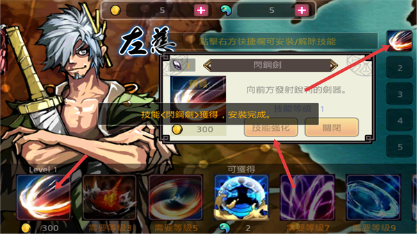 1、首先進入技能界面,可獲得技能并完成安裝,右側技能裝備欄可管理技能,消耗金幣還能進行技能強化。