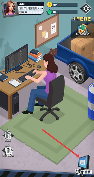 1、在游戲主界面中找到并點擊研發游戲的按鈕,進入研發游戲的設置頁面。