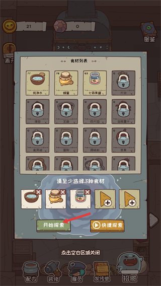 2、進入食材選擇界面后,需至少選3種食材,界面會顯示可選與已選食材,選好后點擊開始探索按鈕,完成后點擊空白區可關閉界面。