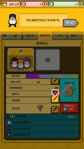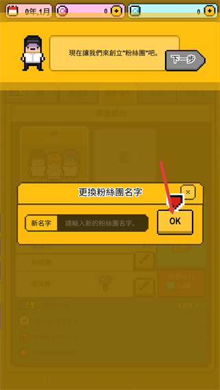 1、在偶像組合界面,點擊粉絲團相關功能入口,按提示創建粉絲團,完成后點擊下一步推進組合運營流程。