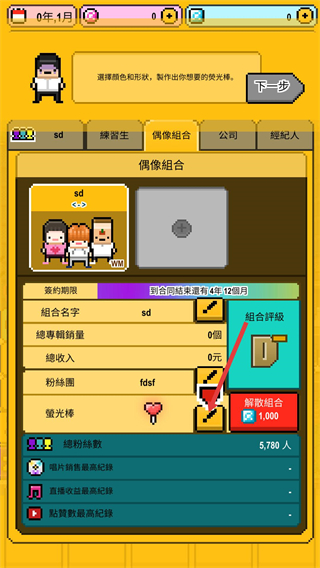 3、在偶像組合界面,按提示進行熒光棒設置,后續可繼續運營組合提升數據。
