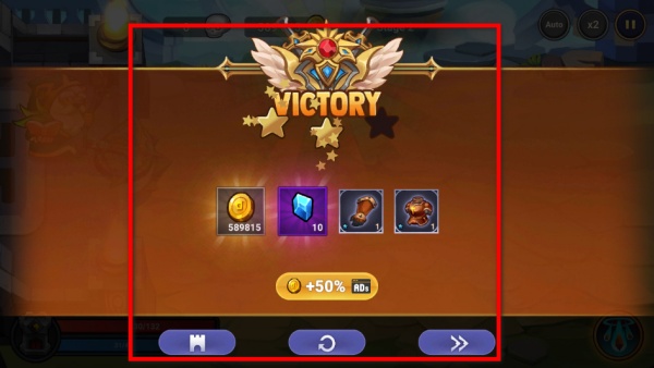 4、成功擊退所有敵人完成關卡,進入結算界面獲取金幣寶石等獎勵,之后可選擇返回主界面或進入下一關繼續挑戰。