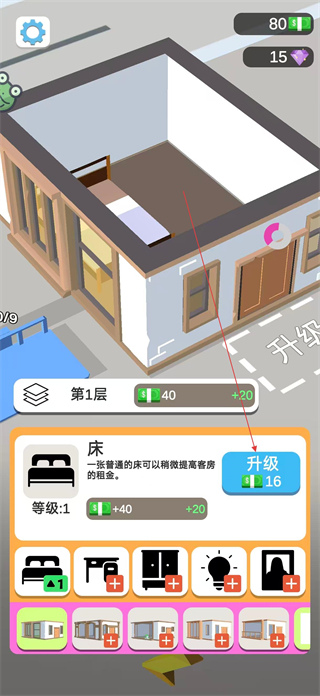 4、進入酒店房間升級界面選擇床等設施進行升級,消耗對應資源提升設施等級,增加酒店房間的收益。