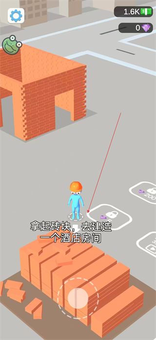 1、進入我的小小酒店游戲,操控角色移動至磚塊堆區域,拿起磚塊按照提示前往對應位置,開始建造酒店房間的基礎結構。