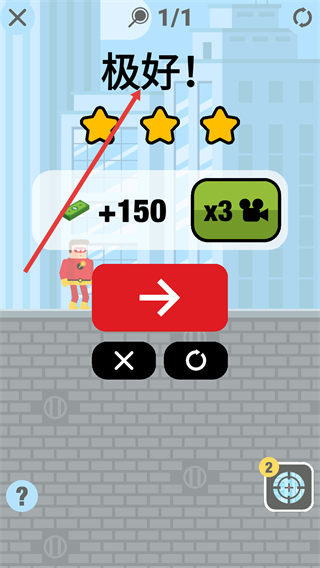 4、關卡完成后會顯示三星評價,獲得金幣與道具獎勵,點擊紅色箭頭按鈕可進入下一關,也能選擇重玩關卡提升表現,及時領取獎勵,繼續推進后續關卡的挑戰。