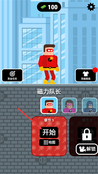1、界面頂部顯示資源數量,左側有賞金任務入口,右側可查看英雄服裝,下方章節1可點擊開始進入關卡,優先選擇章節1的開始按鈕開啟游戲。