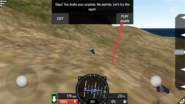 4、若飛機損壞,界面會提示故障信息,此時可點擊PLAYAGAIN按鈕重新試飛,調整操作方式避免失誤,也可選擇EXIT退出當前環節,重新準備飛行嘗試。