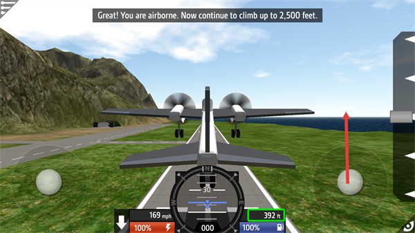 3、飛機成功起飛后,頂部提示需爬升至高2500英尺,操作右側操控按鈕向上調整,控制飛機抬升高度,同時關注高度表的數值變化,逐步接近目標高度。