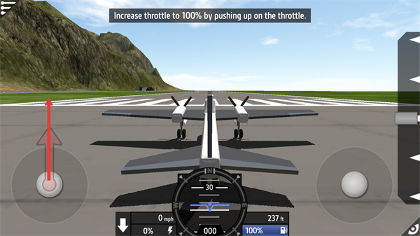 2、進入試飛界面后,頂部提示需將油門推至100,操作左側油門按鈕向上滑動,提升油門數值至滿額,為飛機起飛提供足夠動力,留意速度與高度的變化。