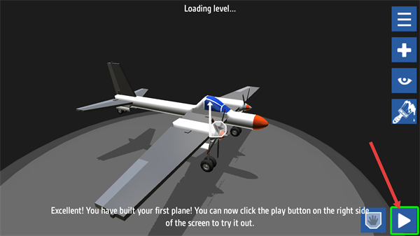 1、完成首架飛機建造后,界面顯示Loadinglevel,此時點擊屏幕右側的播放按鈕,即可進入飛機試飛環節,開啟實際操控流程,體驗飛機的飛行操作。