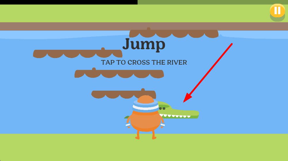 1、進入游戲先看到過河場景,界面提示需點擊河面的平臺,操控角色跳躍前進,同時避開鱷魚,推進過河環節。
