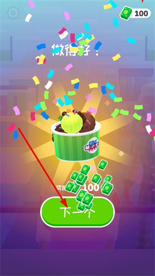 4、完成制作后界面顯示做得好提示及獎勵,點擊下一個按鈕,進入下一個顧客的冰淇淋制作任務,繼續推進游戲流程。