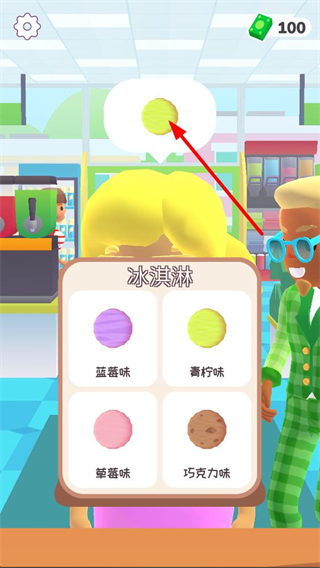 1、進入游戲看到顧客需求為青檸味冰淇淋,界面展示藍莓、青檸等口味選項,點擊青檸味選項,選定對應的冰淇淋口味,推進制作流程。