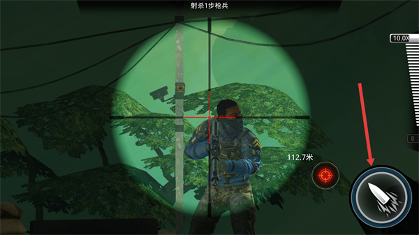 2、瞄準鏡已鎖定目標,顯示目標距離112米,需確認瞄準位置后,配合右側道具按鈕輔助射擊,精準命中目標以完成射殺任務,推進關卡進程。