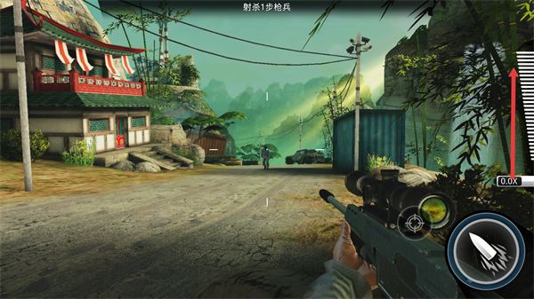 1、界面顯示狙擊任務目標為射殺1名步槍兵,右側有瞄準鏡及道具按鈕,需操控視角鎖定遠處目標,利用狙擊槍瞄準,準備執行射擊操作完成任務要求。