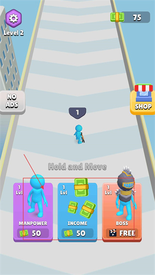 1、關卡初始可選擇增益選項,玩家可選擇加成擴充人群數量,再長按移動藍色角色推進,為后續推進鋪墊基礎。