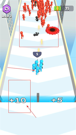 2、行進中需操控藍色人群避開紅色鋸片機關,同時拾取通道中的數量增益,逐步擴大人群規模,保障隊伍擴大。