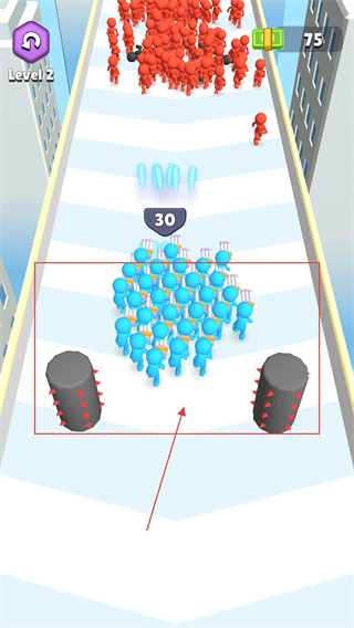 3、接近關卡后期會遇到帶刺機關,需調整人群移動路徑從機關間的空隙穿過,避免人群數量損耗,平穩通過危險區域。