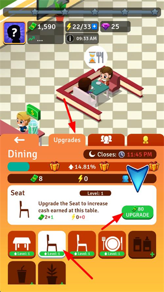 2、切換到用餐區界面,找到Seat選項,點擊UPGRADE按鈕消耗80金幣,可升級座位,升級后該餐桌獲得的金幣收益會增加。