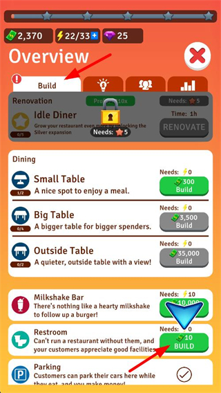 3、打開Overview界面選擇Build選項,找到Restroom對應的BUILD按鈕,消耗10金幣,就能建造衛生間來完善餐廳的設施。