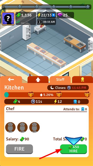 1、在廚房界面看到Chef相關選項,當前廚師數量可調整,點擊HIRE按鈕消耗450金幣,就能雇傭廚師來提升廚房的運營效率。