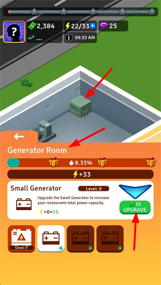 4、在發電機室界面,找到小發電機選項,點擊UPGRADE按鈕消耗10金幣,可升級小型發電機,提升餐廳的總電力容量。