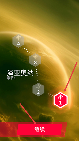 1、進入章節選擇界面,已解鎖的1號關卡呈紅色高亮狀態,點擊下方的繼續按鈕,即可進入該關卡開始游戲。