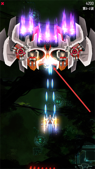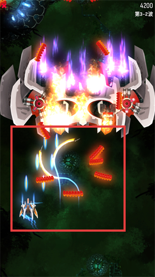 4、面對敵方釋放的大范圍彈幕,需靈活操控戰機移動,躲避紅色彈幕的同時,繼續向敵方單位輸出火力,通過走位與攻擊的配合推進戰斗進度。