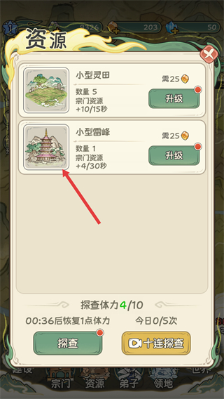 4、領取資源后,資源界面會新增剛獲得的小型雷峰,可看到其數量、資源產出速度,后續可通過升級按鈕提升該資源建筑的等級,以增加宗門資源的獲取效率。