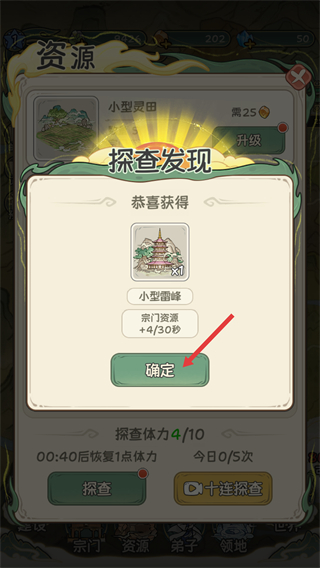 3、完成探查后會彈出探查發現的提示框,顯示獲得的資源,比如此次獲得小型雷峰,點擊確定按鈕可領取該資源并關閉提示框,繼續進行后續的資源操作或探查。