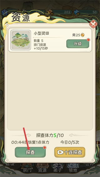 2、進入資源界面后,能看到小型靈田的信息,還有探查體力相關顯示,點擊探查按鈕可消耗體力獲取資源,也可選擇十連探查,不過需注意體力的恢復時間和每日探查次數限制。