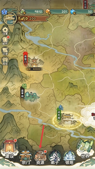 1、界面顯示宗門地圖,包含血煞門、藍草林等區域,底部有建設、宗門、資源等功能按鈕,其中資源按鈕是獲取資源的入口,點擊它可進入資源界面,這是提升宗門資源的關鍵步驟。