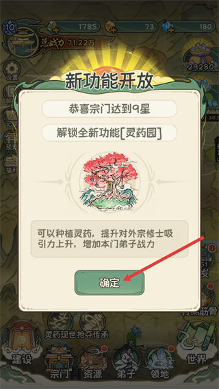 4、領取獎勵后會彈出新功能開放提示,顯示宗門達9星解鎖【靈藥園】功能,該功能可種植靈藥,提升外宗修士吸引力、增加弟子戰力,點擊確定按鈕即可開啟該功能。